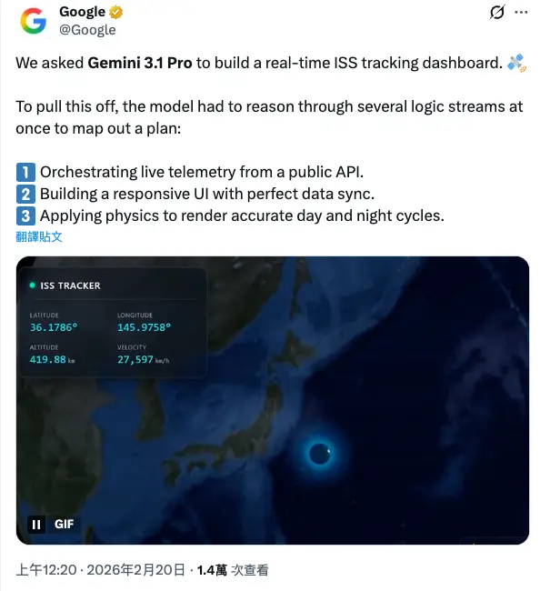 這段示範的重點不在於「API、UI、物理」本身,而是它在強調 3.1 Pro 的能力是「多條邏輯流並行推理,再收斂成一個可執行方案」。