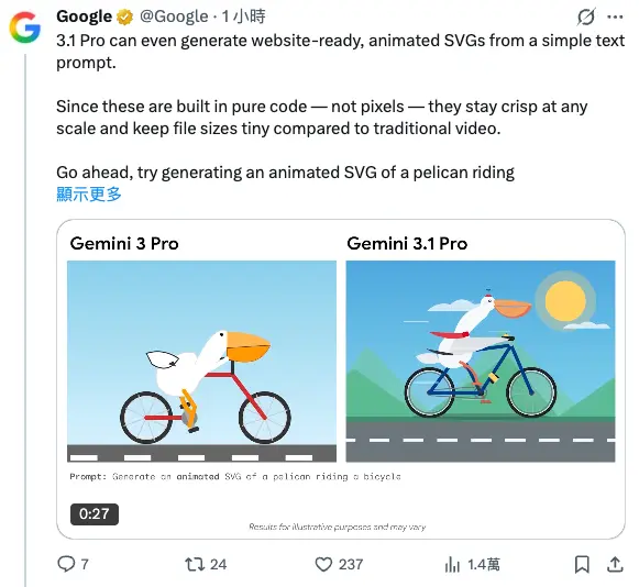 另一個很具體的亮點是:3.1 Pro 可以用文字提示,生成網站可用的動畫 SVG。